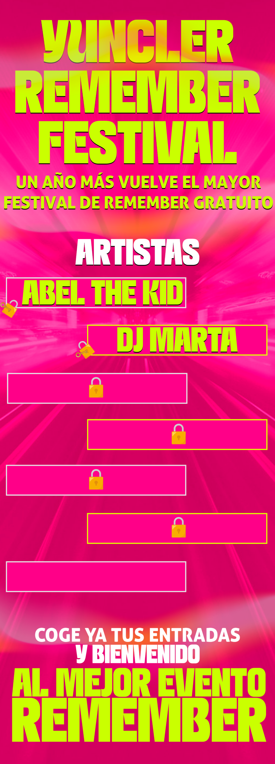 Yuncler Remember Festival está pensado para revivir tus mejores noches al ritmo del dance, house, techno y makina de los 90 y 2000. El acceso está reservado para mayores de 18 años y se recomienda especialmente para mayores de 21. Si quieres vivir una experiencia musical cargada de recuerdos, energía y buen rollo, esta es tu cita del verano.